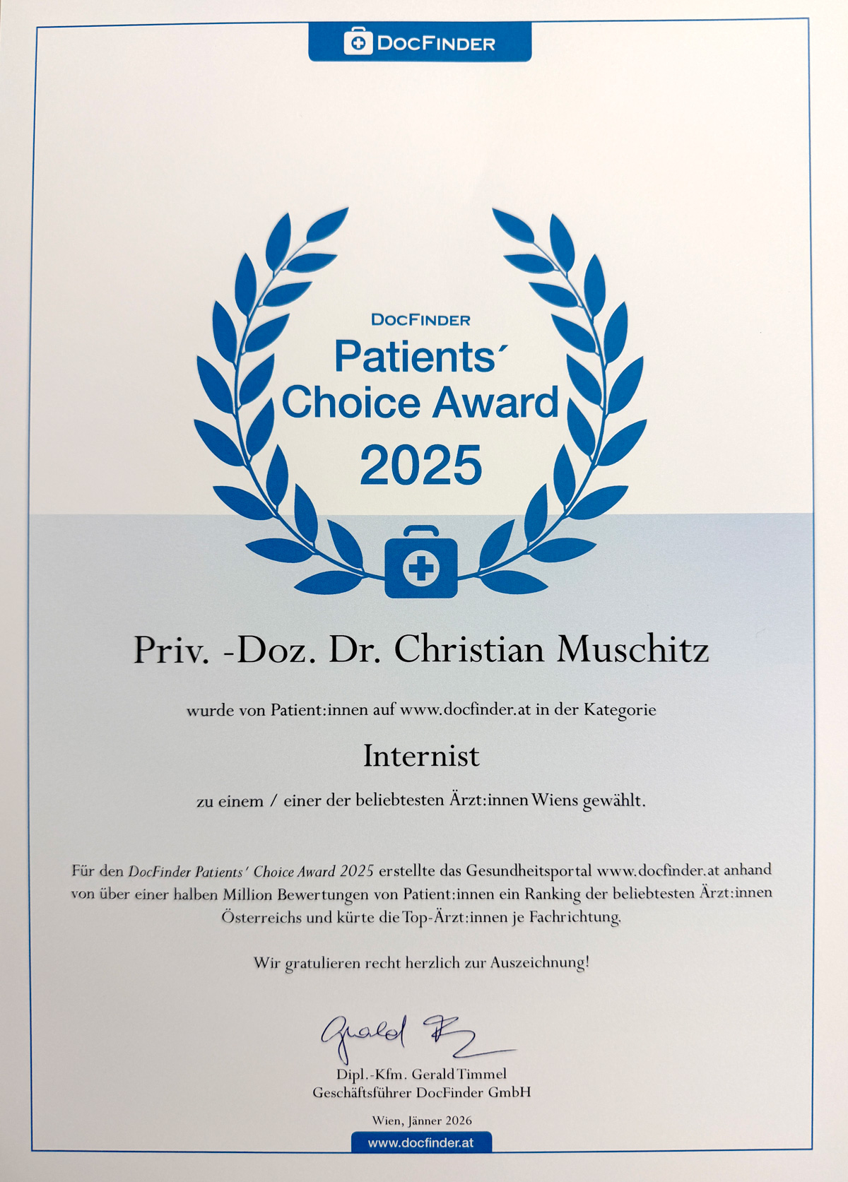 Die Auszeichnung mit dem DocFinder Patients’ Choice Award 2025 erfüllt mich mit großer Freude – vor allem, weil sie auf dem Vertrauen meiner Patientinnen und Patienten basiert. Mein herzlicher Dank gilt allen, die mir dieses Vertrauen schenken. Sie bestärken mich darin, Medizin mit Aufmerksamkeit, Empathie und auf Grundlage aktueller wissenschaftlicher Erkenntnisse zu leben und weiterzugeben.